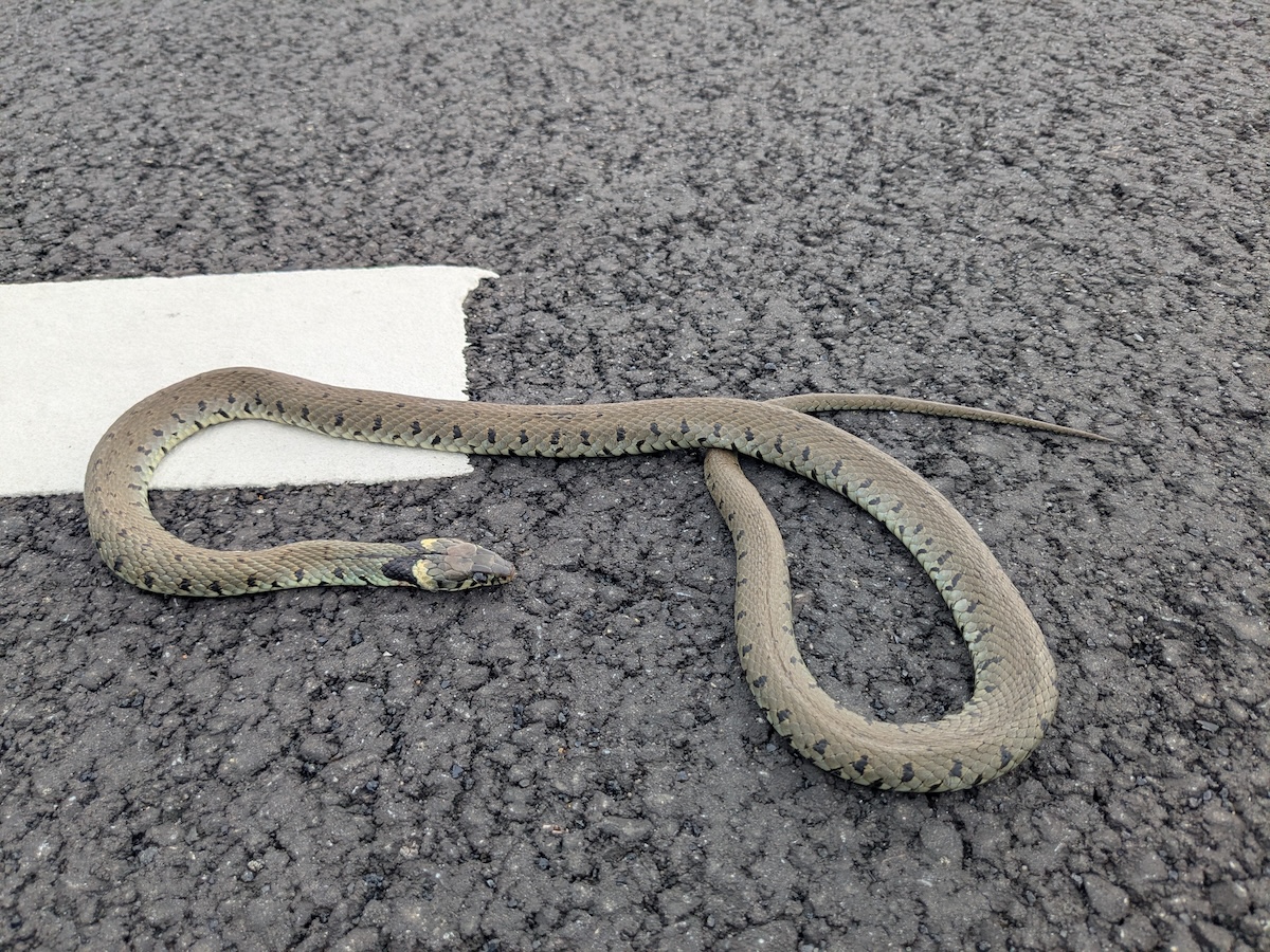 And so we headed off from our cute house in Noord, to head east toward the end of our trip. Our path out of Noord took us across the Buiten IJ (the main waterway separating Amsterdam from Noord) east of the city. It was a long wait to cross at a drawbridge. We encountered lots of friendly cycle groups coming the other way as we headed southeast along the south of IJmeer. We finally crossed to the north side of Gooimeer, which we rode along for 10 km. With not a huge density of welcoming cafes along the way, we ended up sheltering from some light rain under a sales office for a green development along Goimeer. On our way out of the development, we passed a dead, but remarkably alive-looking, grass snake on the road: our first snake of the trip!