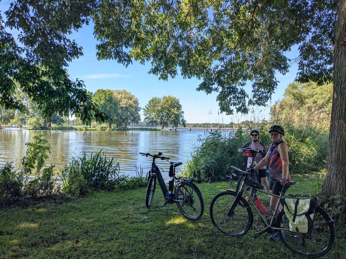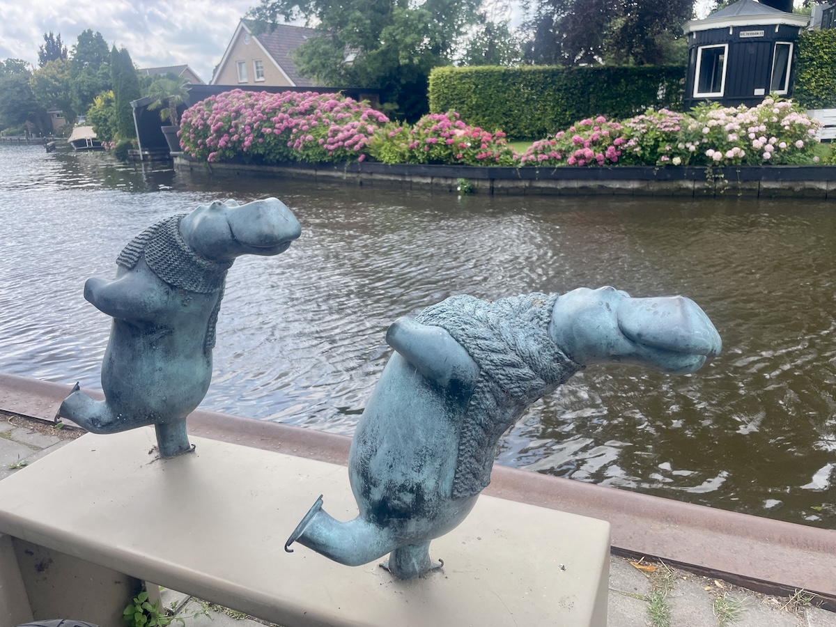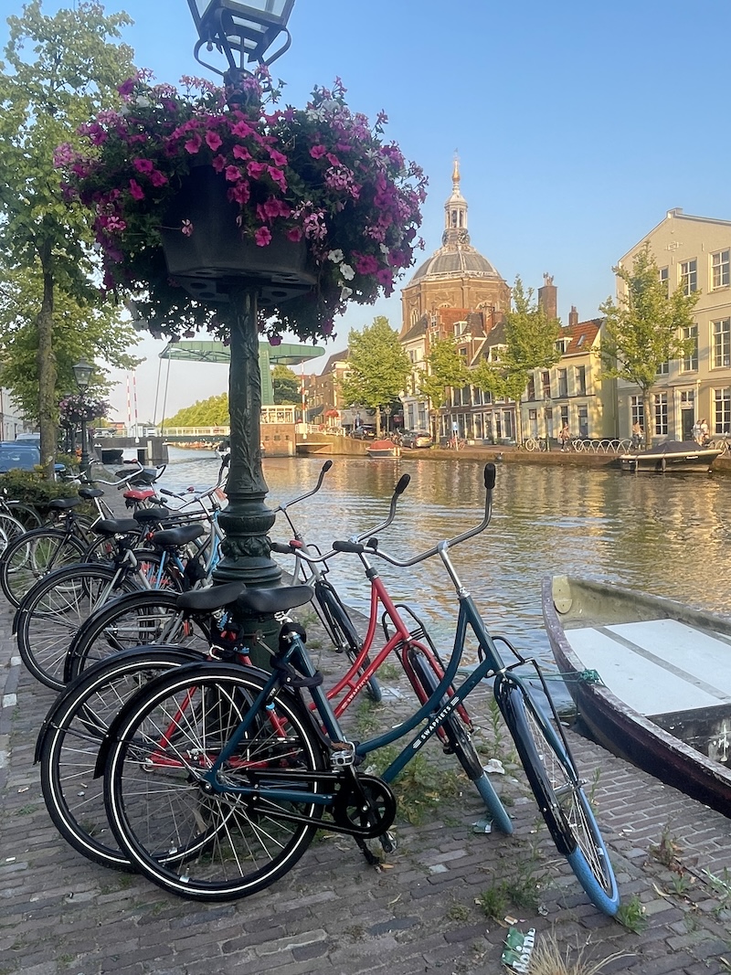 Only 15 km today, thankfully, as it was humid and heading toward 28 degrees. After a late check-out we ambled down the canal (which was humming with Saturday traffic) and into the outskirts of Alphen, where our big hotel at the Avifauna Park sat. We dumped our bags there and rode the 2.4 km into town for lunch in a cafe terrace on the canal with a bit of a breeze ameliorating the heat somewhat (having being told off by a local in the first 5 m of riding into a pedestrian mall, another cultural learning).