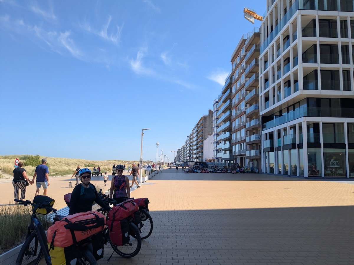 After breakfast at a cafe in the town square of De Panne, we packed up and headed up the coast. Well, the Belgian coast was quite a surprise. A seemingly endless line of uniformly high-rise apartment blocks servicing a booming tourist trade along the wide sandy beaches (a contrast to the cobbles and cliffs of Normandy). Our ride was a slow weave through the busy promenades of De Panne, Koksijde, Nieupoort, Middelkerke, Oostende and Bredene. The various pedal vehicles along the promenade were pretty wild as well as some little electric kids bikes. A sight to behold as we managed to navigate through them.