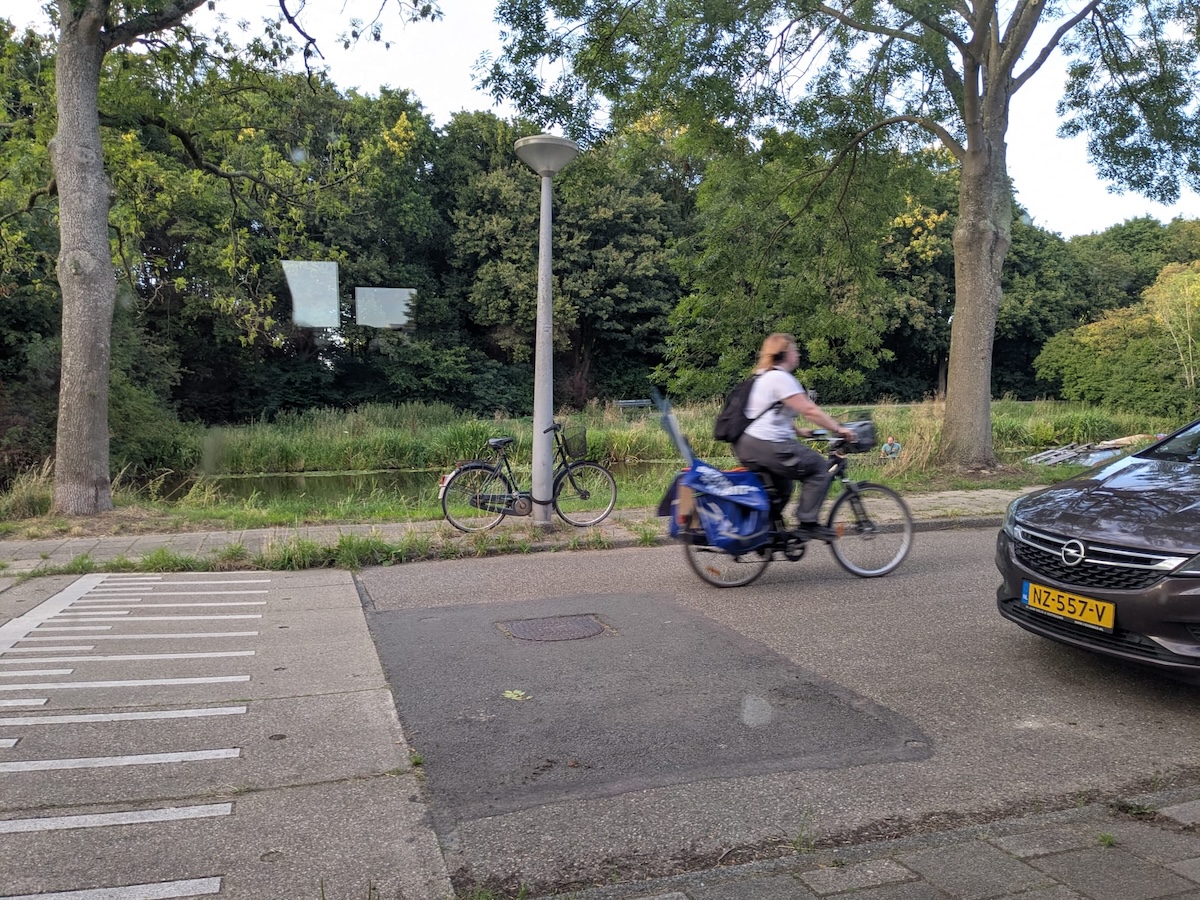 While Maree went off for a haircut, Chris intended to head south to Alphen to pick up his keys that he had left at the hotel there. He had thought it was going to be a quick 23 km ride each way for some reason, but it was actually 45 km each way. So, he booked a return ticket plus bike to Hoofddorp. The train trip was good (a single bank of 3 folding seats for the bike), and cycle.travel suggested a route to Alphen different from our last ride to Hoofddorp. Once the keys were retrieved, cycle.travel plotted a a third completely different, and still lovely, route back to Hoofddoorp. This time with lunch at a nice canal-side cafe in Woubrugge, a cute little ferry and a long wait at a drawbridge.