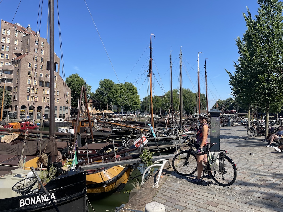 We looped back to Het Park and our first cafe stop to try out the Maastunnel, which we had noticed over our coffee. Quite an impressive bit of bicycle infrastructure, which took us the other side of the Maas, where we jumped on a water taxi across to Massavenkade. There, we found a nice place for iced coffees (black, good). Across the Rijnhavenburg footbridge to the busy cruise terminal dock where we paused to watch a navy boat docking. We then joined the massive cycling commuting crowd around the docks to the Willemmsbrug bridge, across to the cute canal/dock at the Cube/Mariniers Museum in Oude Haven.