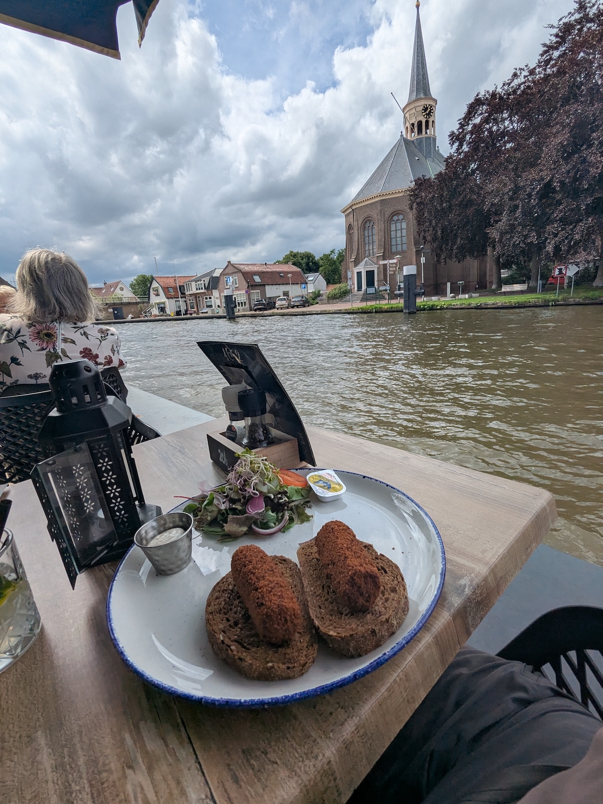 Being a Sunday, and our ride being through a lot of rural forest, we weren’t super optimistic about finding a place for lunch, but we ended up being spoilt for choice and had a good lunch on a terrace overlooking a lovely garden and soccer pitch in Vierhouten (A weird tomato soup with a fatty lump of meat in it for Maree—note to future selves: don’t order the tomato soup—, and a strange open brie and mushroom sandwich for Chris).